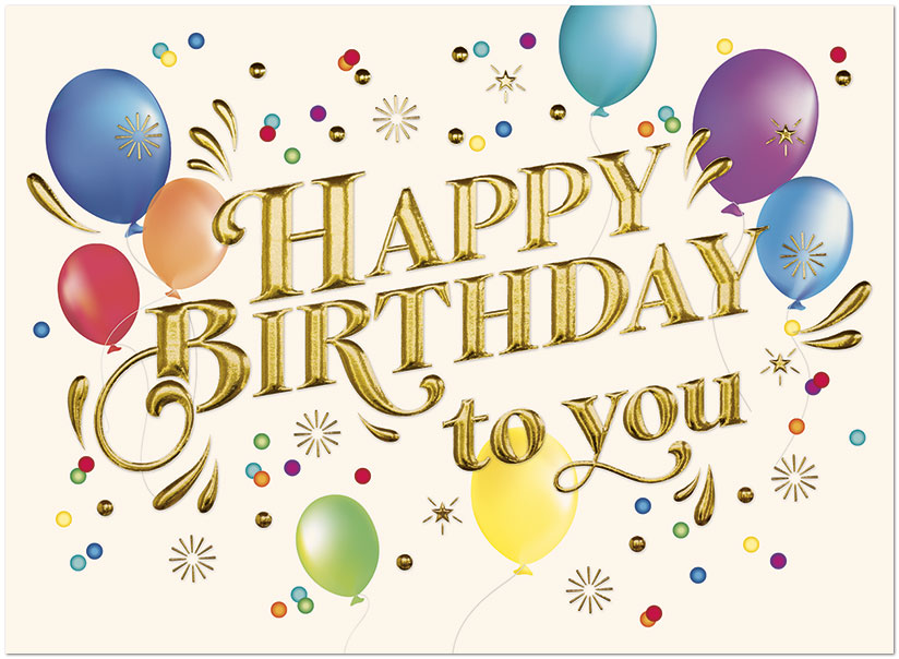 This classic birthday card features colorful balloons and gold foil embossing on matte vanilla FSC® paper.