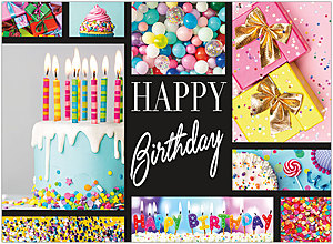 This fun birthday card features cake, presents, balloons and confetti to wish someone a great day. Printed on satin FSC® paper.