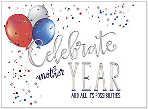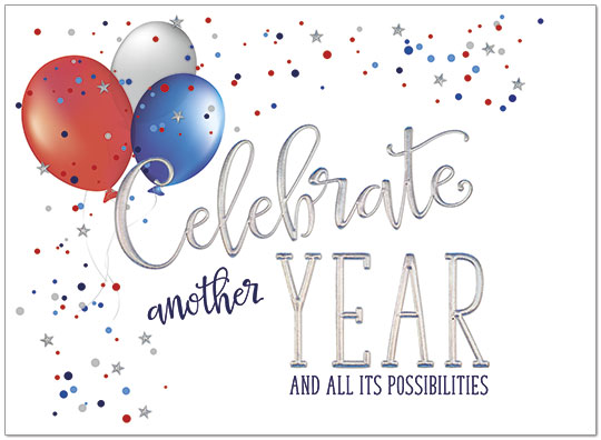 This business birthday card features a fun balloon design in red, white and blue with silver holographic foil embossing. Printed on matte FSC® certified paper.