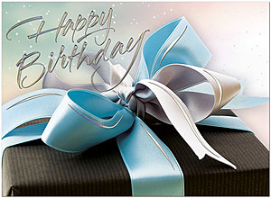 An elegant birthday card featuring a gift with blue ribbon and silver holographic foil embossing on matte FSC® paper.
