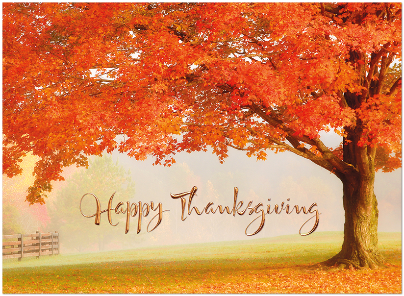 This business Thanksgiving card features a glowing autumn tree with copper foil embossing. Printed on matte FSC® paper.