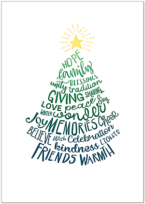This uplifting word illustration of holiday sentiments is printed with soy ink on 30% recycled, FSC® paper with an earthy look and feel.