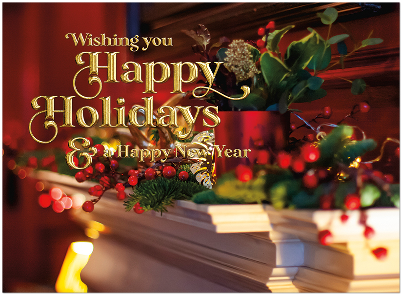 This warm mantle scene features red holly berries and beautiful gold lettering featuring gold foil embossing on satin FSC® paper.