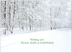 This holiday card features a serene forest blanketed in snow. Printed on matte FSC® paper.