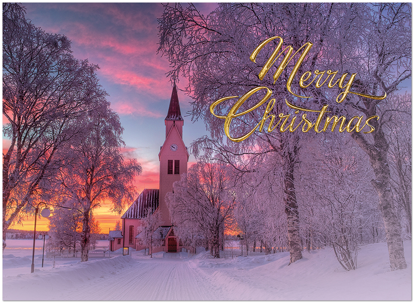 A Christmas card featuring a stunning sunset church and gold foil embossing. Printed on matte FSC® paper.