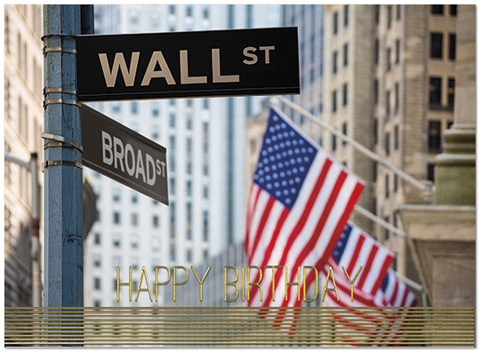 A patriotic Wall Street birthday card featuring gold foil embossing on coated, FSC® certified paper.