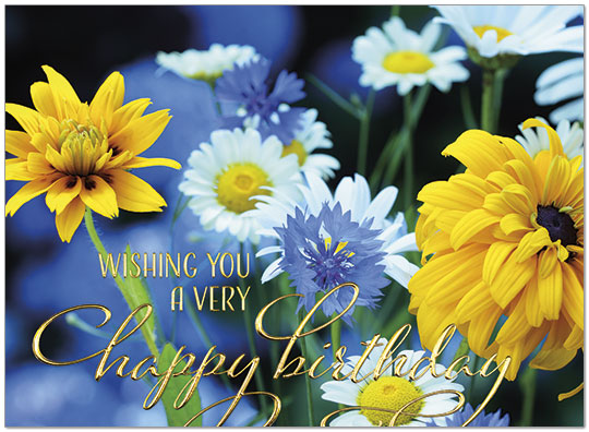A cheerful floral birthday card with gold foil embossing, printed on satin FSC®certified paper.